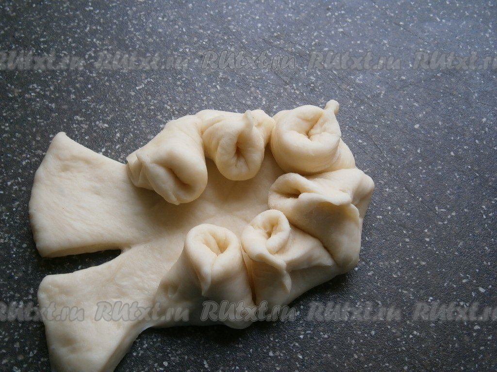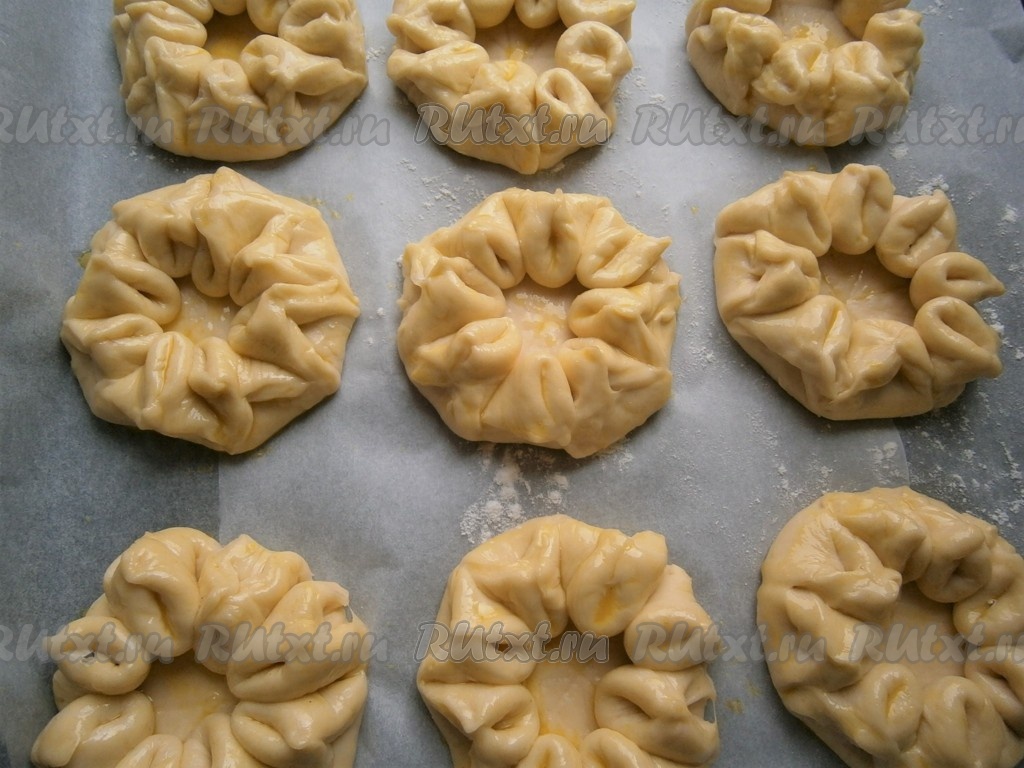 Противень застелить пергаментом и выложить все подготовленные заготовки булочек на достаточном расстоянии друг от друга, смазать их желтком, смешанным с 2 чайными ложками воды.