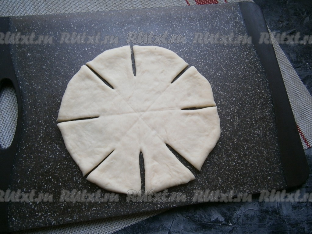 Затем разрезать лепёшку по секторам, начиная от края к середине (до половины, как на фото).