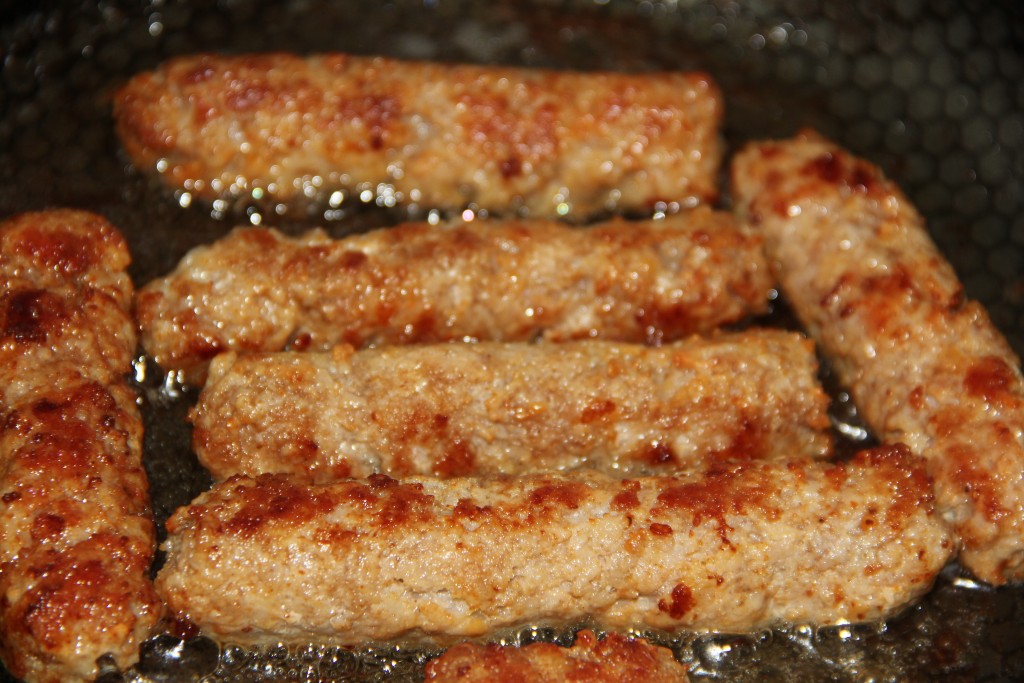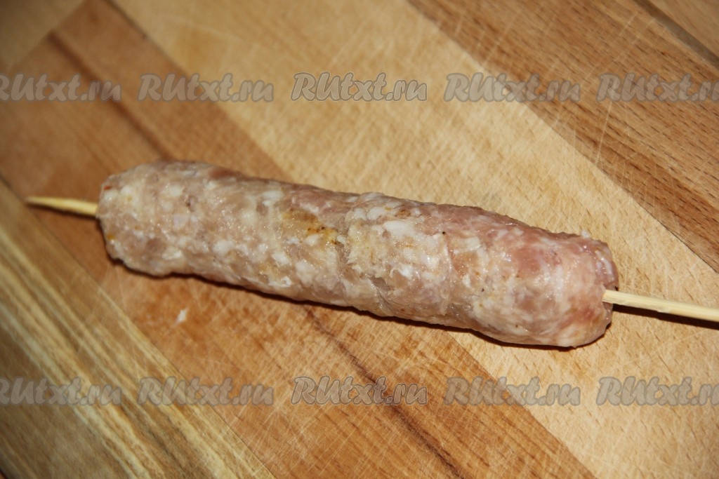 Аккуратно извлечь шпажку. Выложить колбаски, сформированные с помощью бутылки, на сковородку, разогретую с маслом.