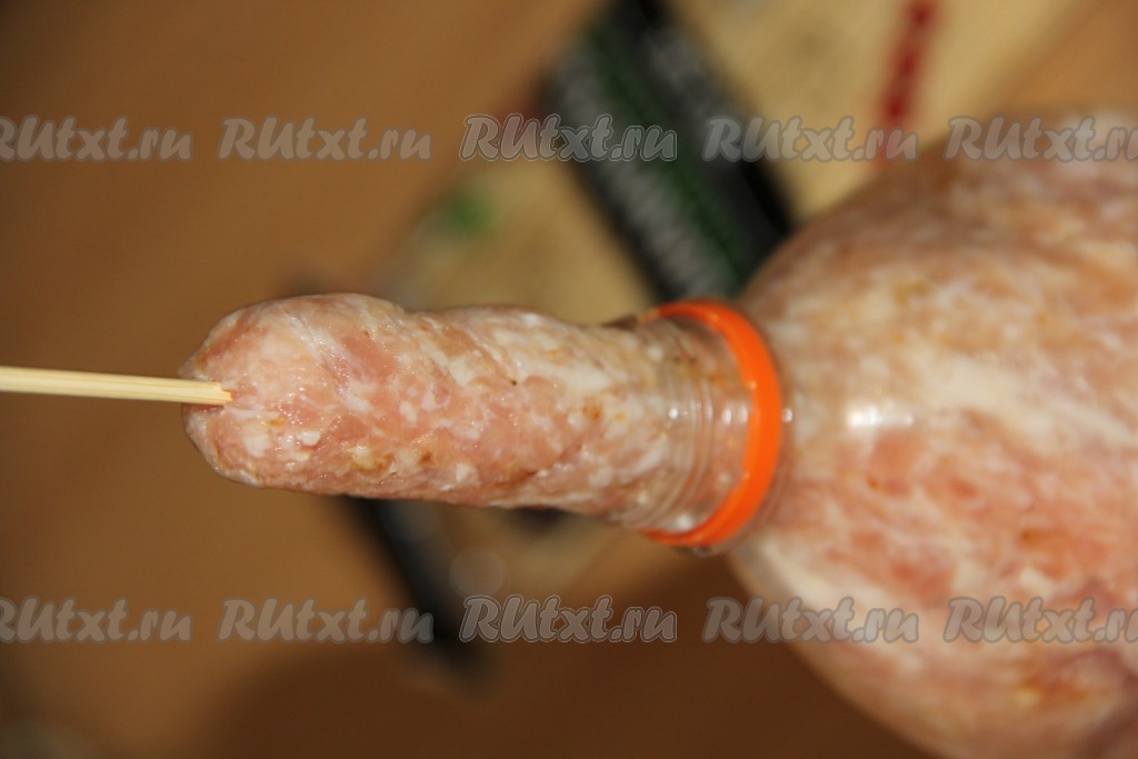 Нажать на бутылку и фарш вылезет из горлышка на шпажку ровной колбаской.