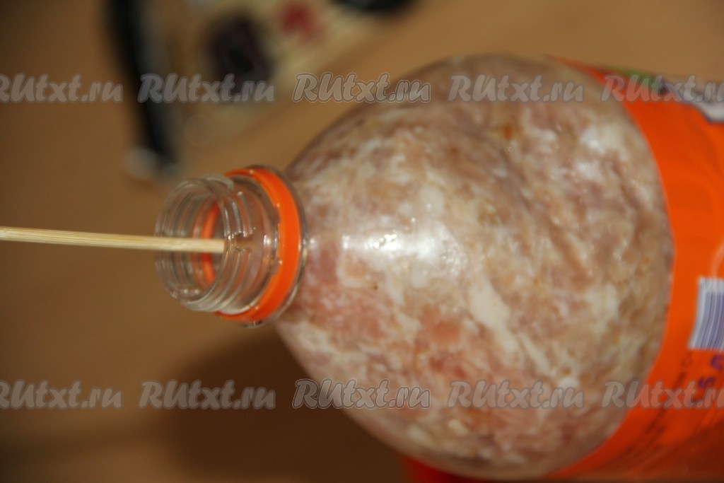Выложить фарш в часть бутылки с горлышком. Другую часть разрезанной бутылки вставить донышком в бутылку, как пресс для фарша. Вставить в горлышко бутылки шпажку.