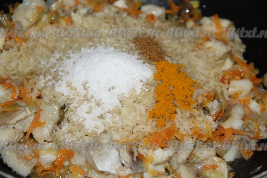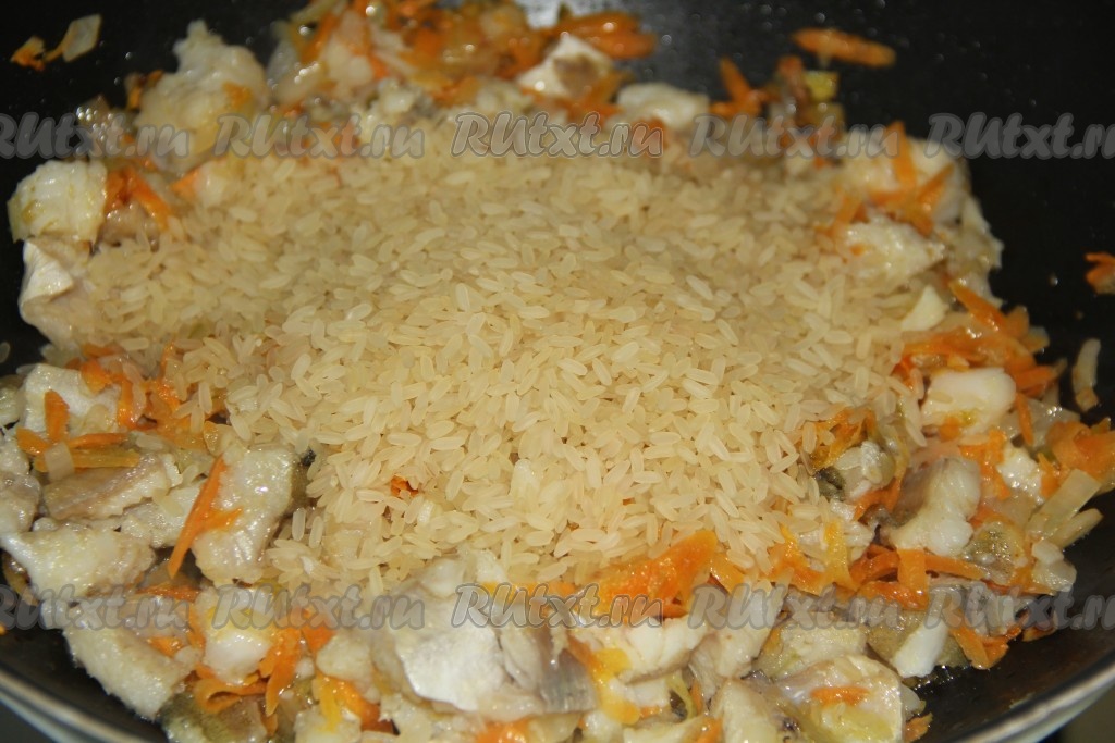Рис промыть, а затем всыпать в сковороду с минтаем и овощами.