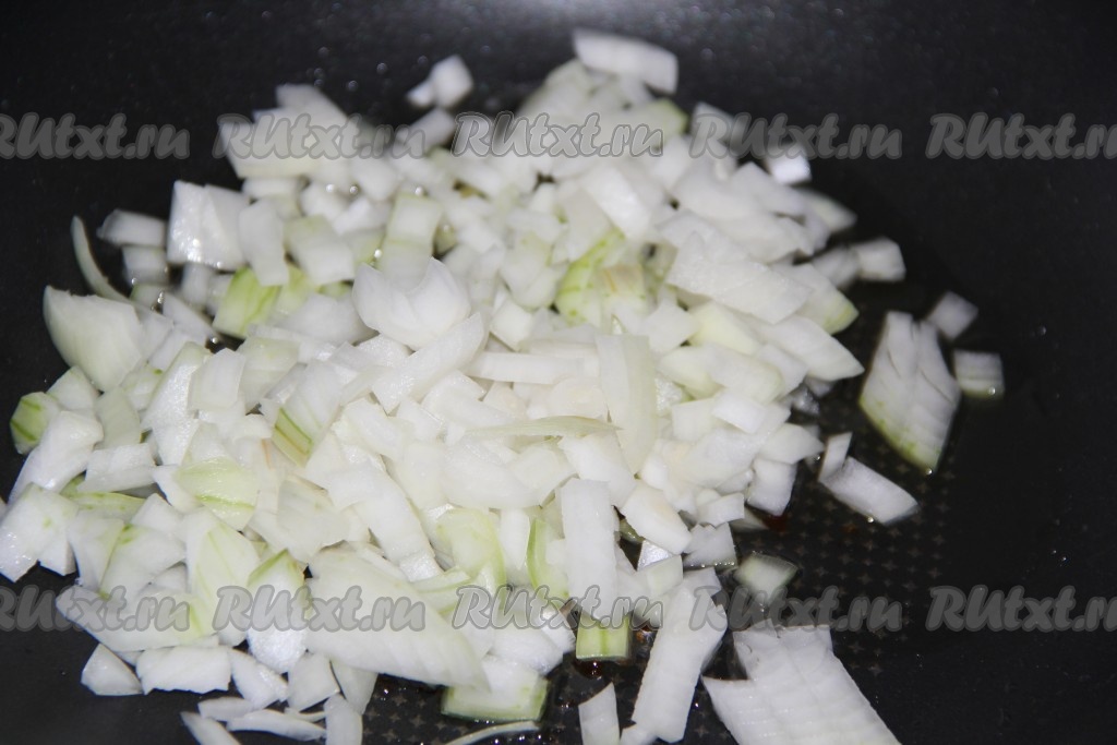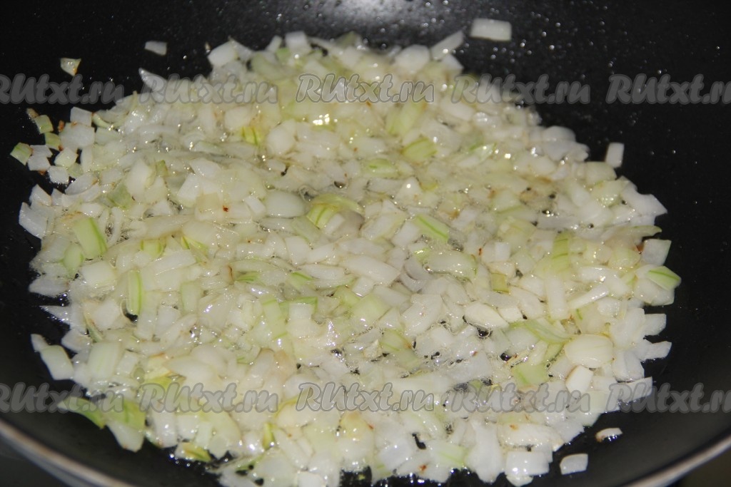 Очистить луковицу, мелко нарезать, а затем выложить в достаточно глубокую сковороду, разогретую с растительным маслом.