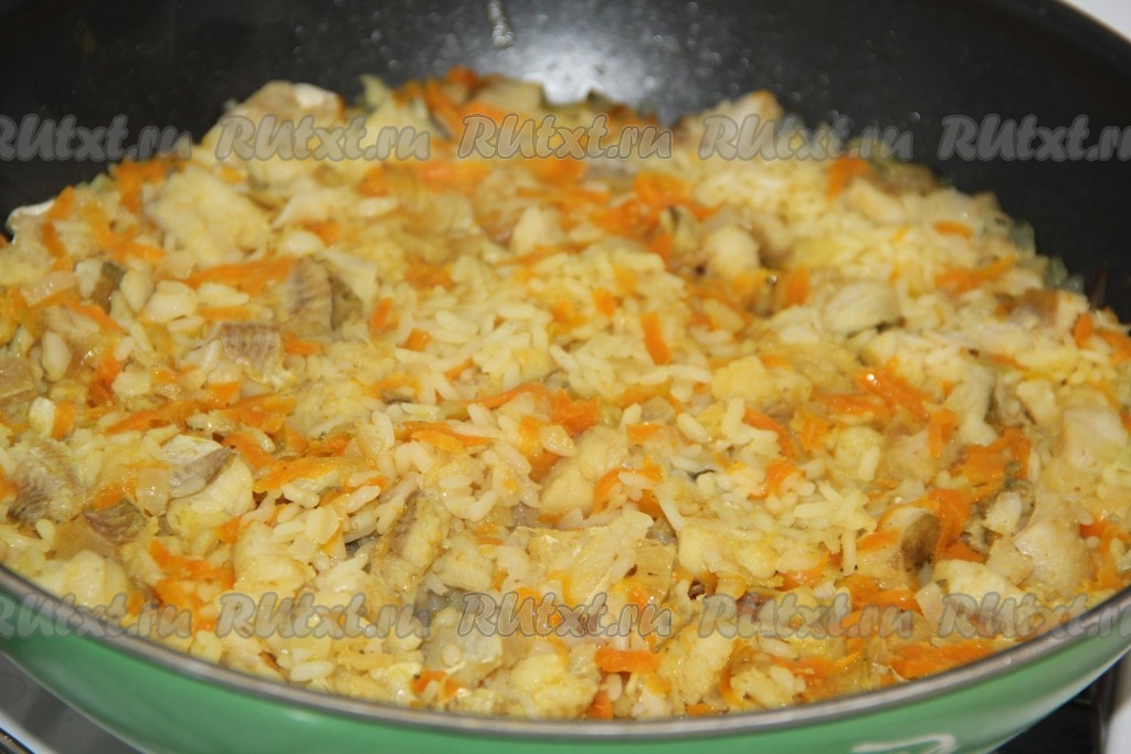 Готовить минтая с рисом, накрыв сковороду крышкой, на среднем огне, примерно, 30 минут (до полного испарения воды).