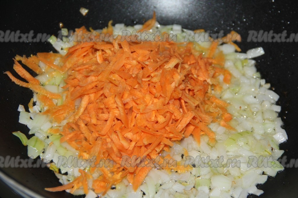 Морковь почистить, натереть на крупной тёрке, а затем выложить к обжаренному луку.