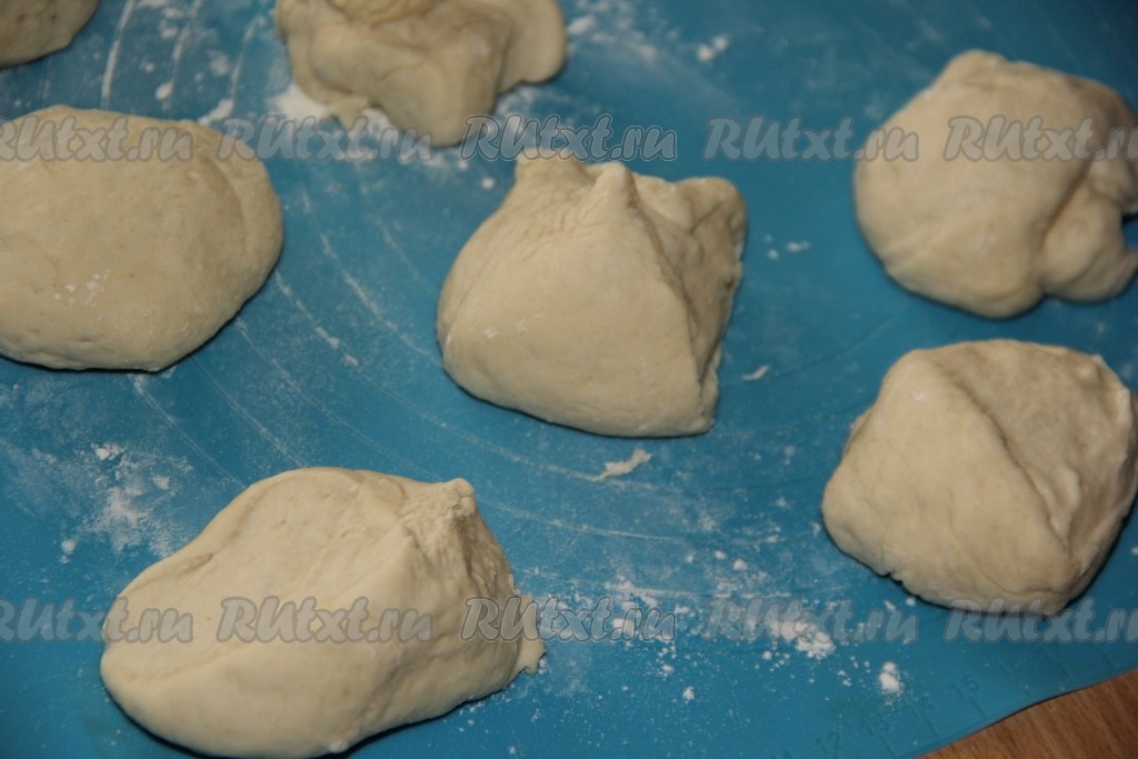 Поднявшееся тесто обмять и на поверхности, присыпанной мукой, разделить на 10 частей.