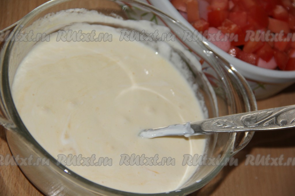 Для приготовления заливки в отдельной миске соединить сметану, яйца, воду, соль и специи.