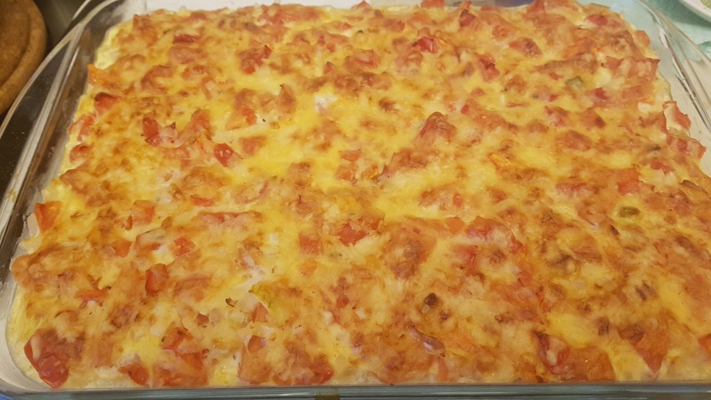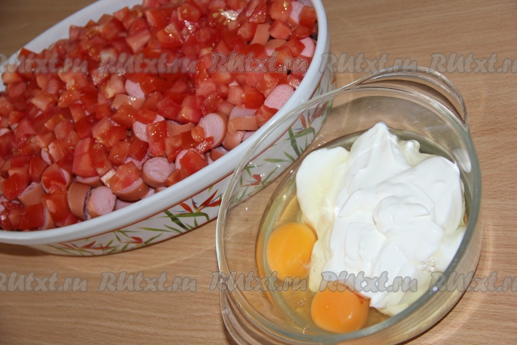 Равномерно вылить заливку в форму поверх помидоров и сосисок.