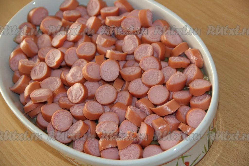 Сосиски нарезать на кружочки и выложить поверх макарон.