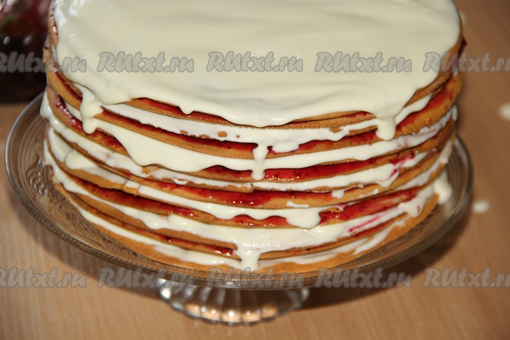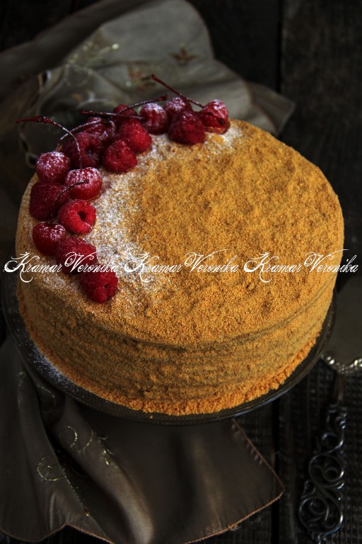 Теперь можно приступать к сборке медовика. Несколько коржей нужно отложить в сторону (они потребуются для обсыпки торта). Первый корж медовика смазать кремом, сверху выложить второй корж, смазать ягодной массой, выложить следующий корж, смазать кремом. Таким образом собрать весь торт, чередуя коржи, смазанные клюквенной массой, и коржи, смазанные кремом. Верхний корж должен быть смазан кремом.