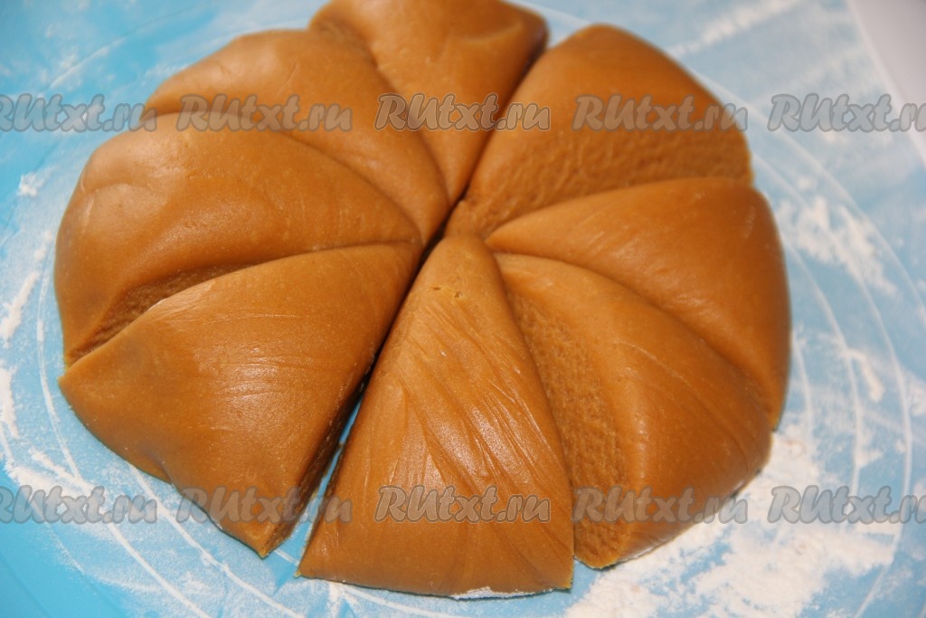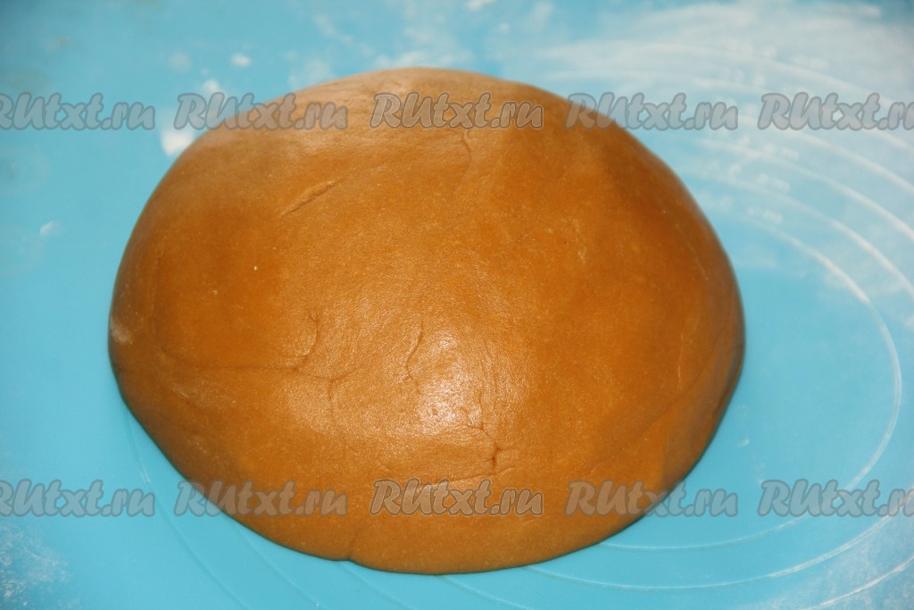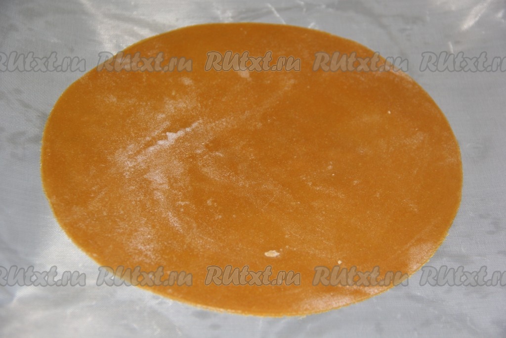 Замесить мягкое и нежное тесто, выложить его на коврик (или на другую поверхность), припылённую мукой, и хорошо вымесить. Если тесто будет сильно липнуть, слегка припылите его мукой. Завернуть тесто в плёнку и убрать в холодильник на 1 час.