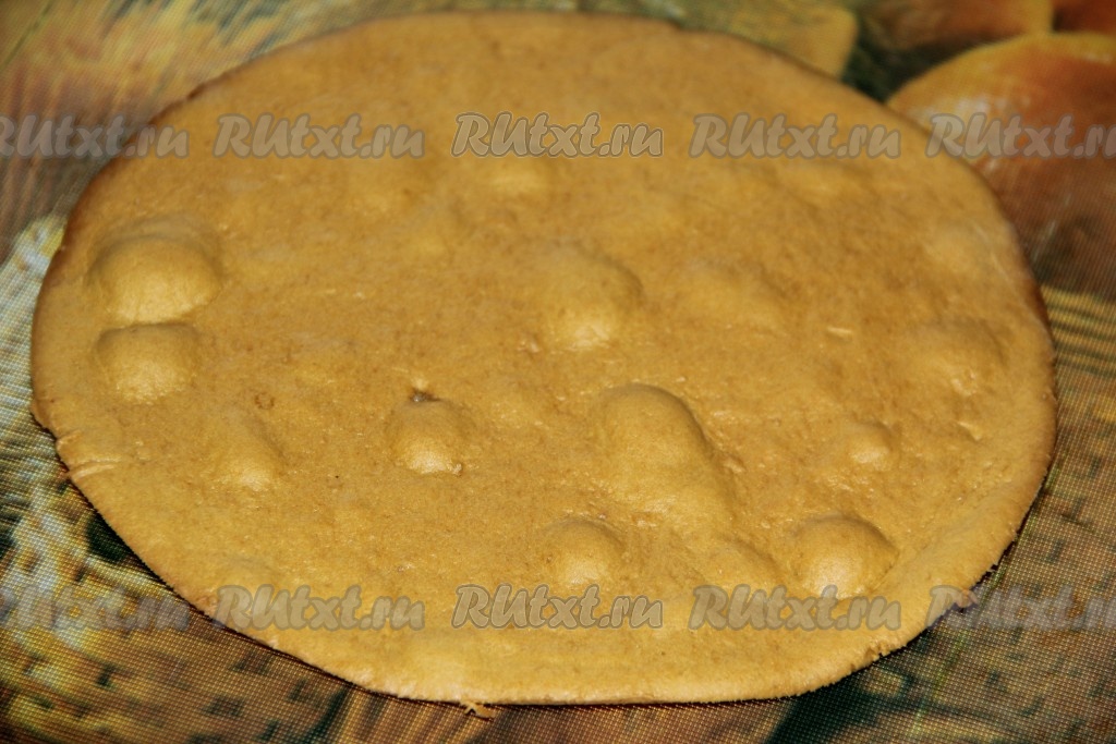 Каждую часть теста на припылённой мукой поверхности раскатать скалкой и вырезать круг. Диаметр торта выбирайте сами (у меня диаметр круга 20 см).