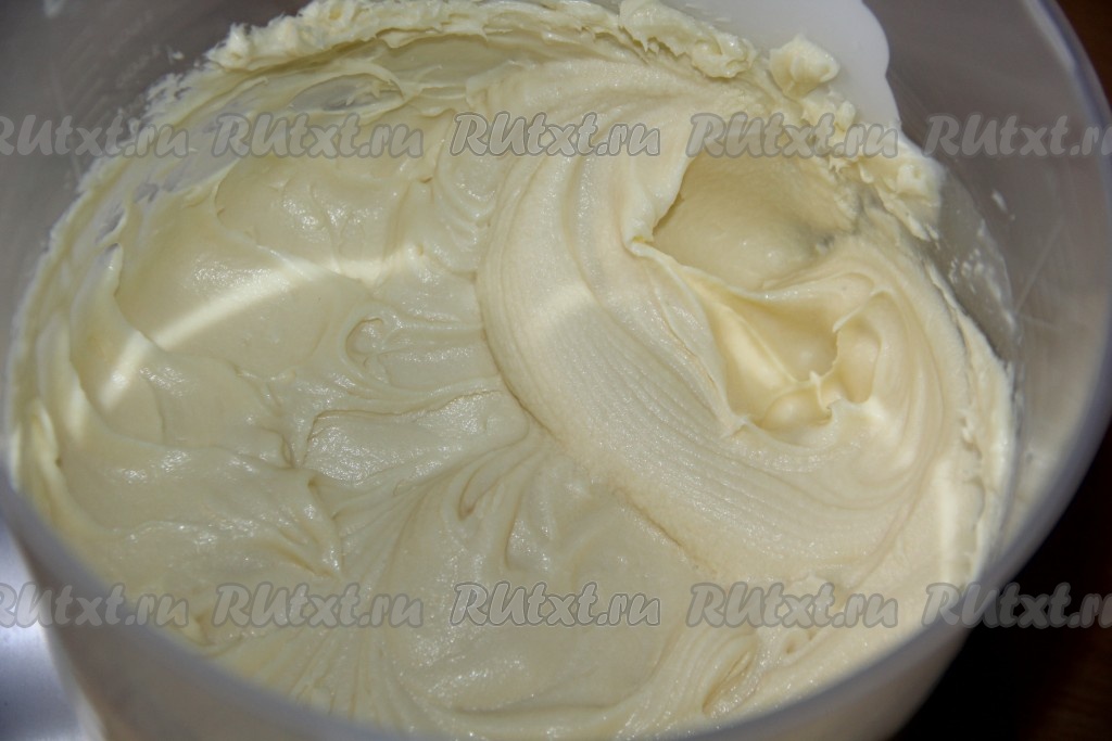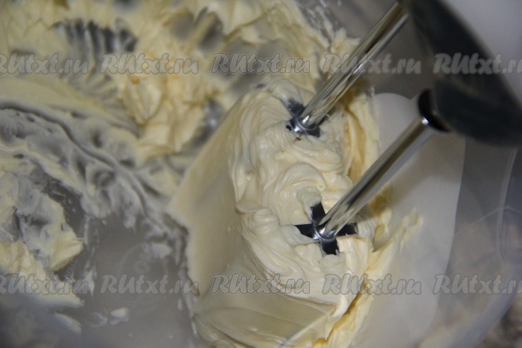 Для приготовления крема сливочное масло должно быть мягким (его нужно заранее достать из холодильника, чтобы оно полежало при комнатной температуре и хорошо размягчилось). Мягкое масло взбить миксером в течение 5-7 минут.