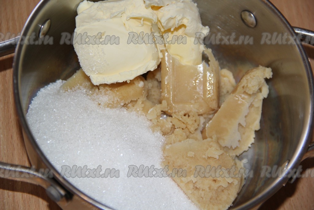 Для замешивания теста в кастрюлю с толстым дном выложить сахар, сливочное масло и мёд.