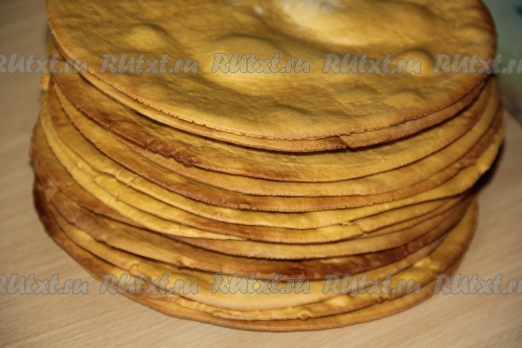 Остатки теста я тоже в дальнейшем раскатала, вырезала круги и испекла коржи. Всего у меня получилось 13 коржей диаметром 20 см. Готовые коржи остудить.
