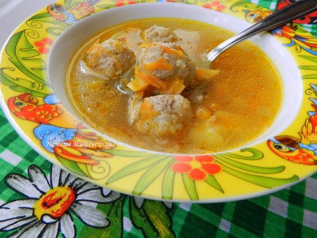 Вкусный, сытный, аппетитный суп с фрикадельками из свинины готов.