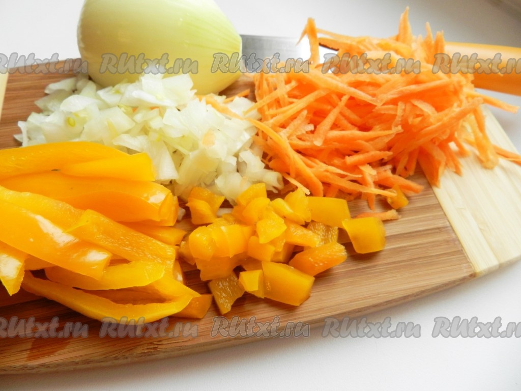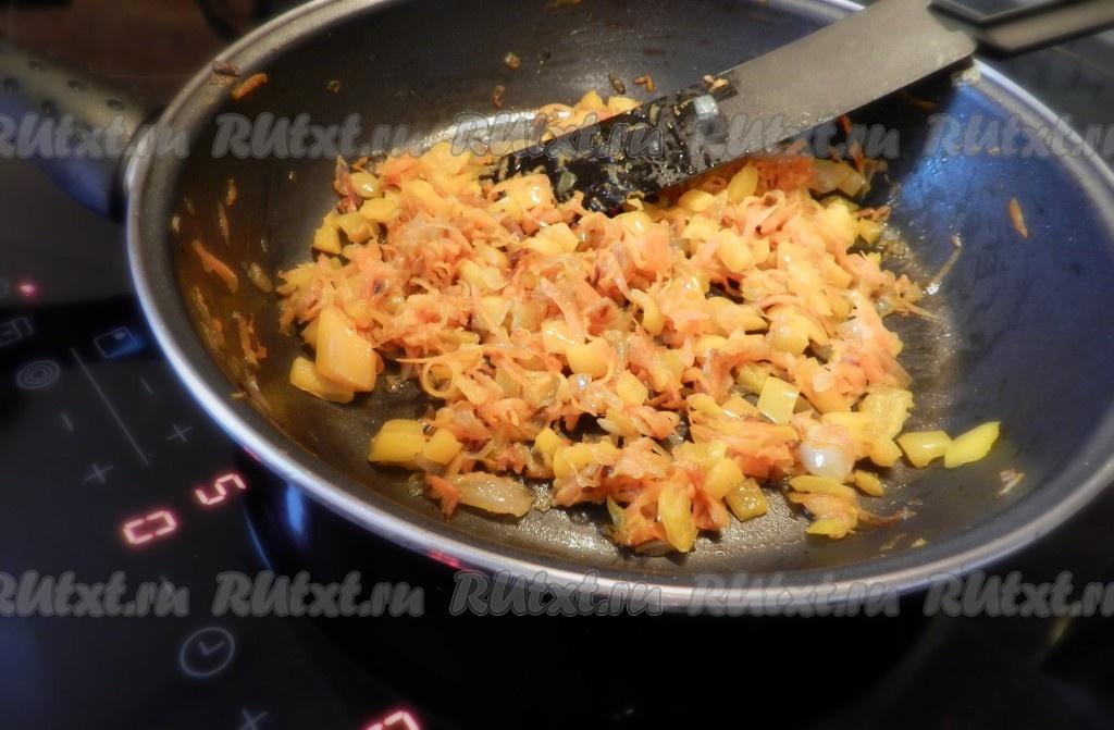 Обжарить на растительном масле лук с морковью до золотистого цвета. Затем добавить на сковороду болгарский перец, посолить, поперчить и обжарить овощи ещё в течение 5-7 минут, не забывая иногда перемешивать.