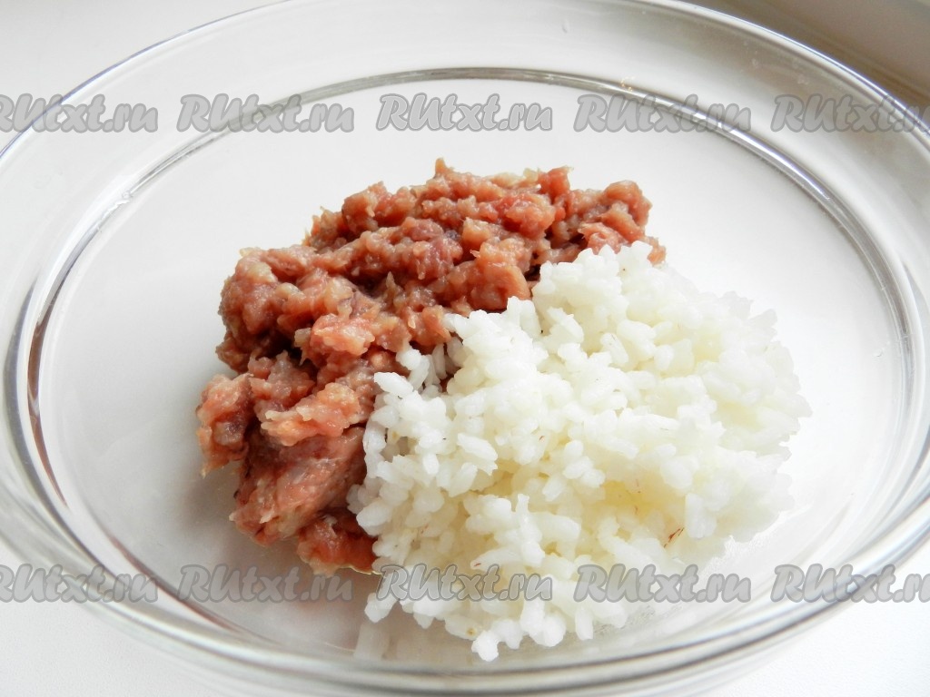 Свинину и половину луковицы пропустить через мясорубку. Рис отварить до готовности, смешать со свиным фаршем, добавить соль и перец.