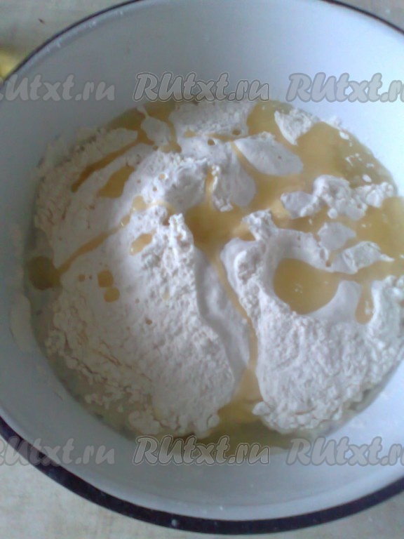 В миску всыпать сахар, соль и соду, добавить уксус и перемешать (сода погасится). Затем влить воду, перемешать. Просеять муку в миску и влить растительное масло,