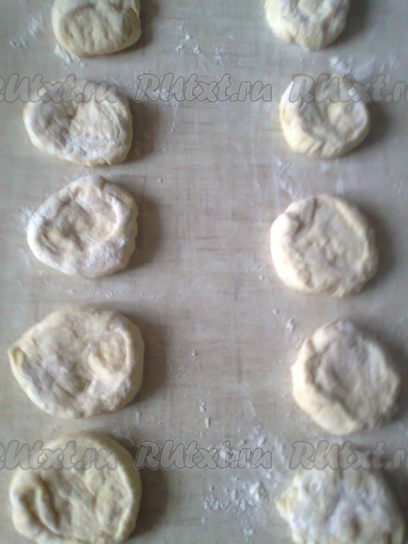 Каждую часть теста на поверхности, припылённой мукой, приплюснуть в лепёшку и раскатать до желаемого размера.