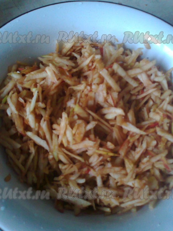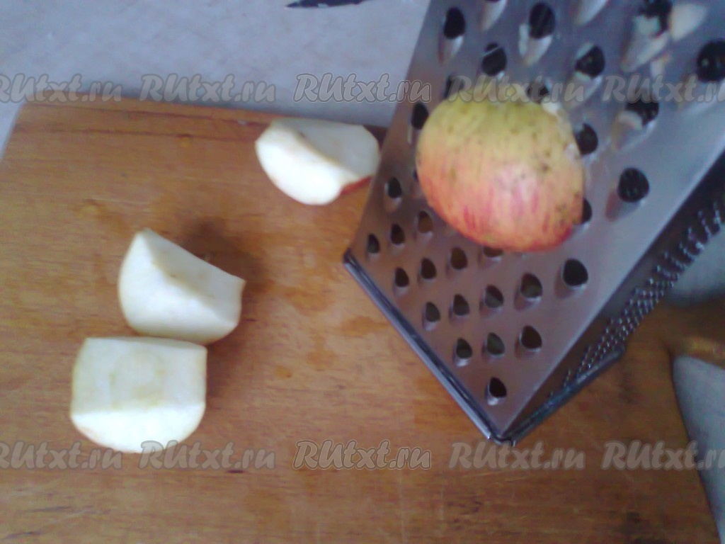 Для приготовления начинки надо разрезать яблоки пополам (или на четвертинки), очистить от семечек и натереть на крупной тёрке так, чтобы кожура осталась в руках.
