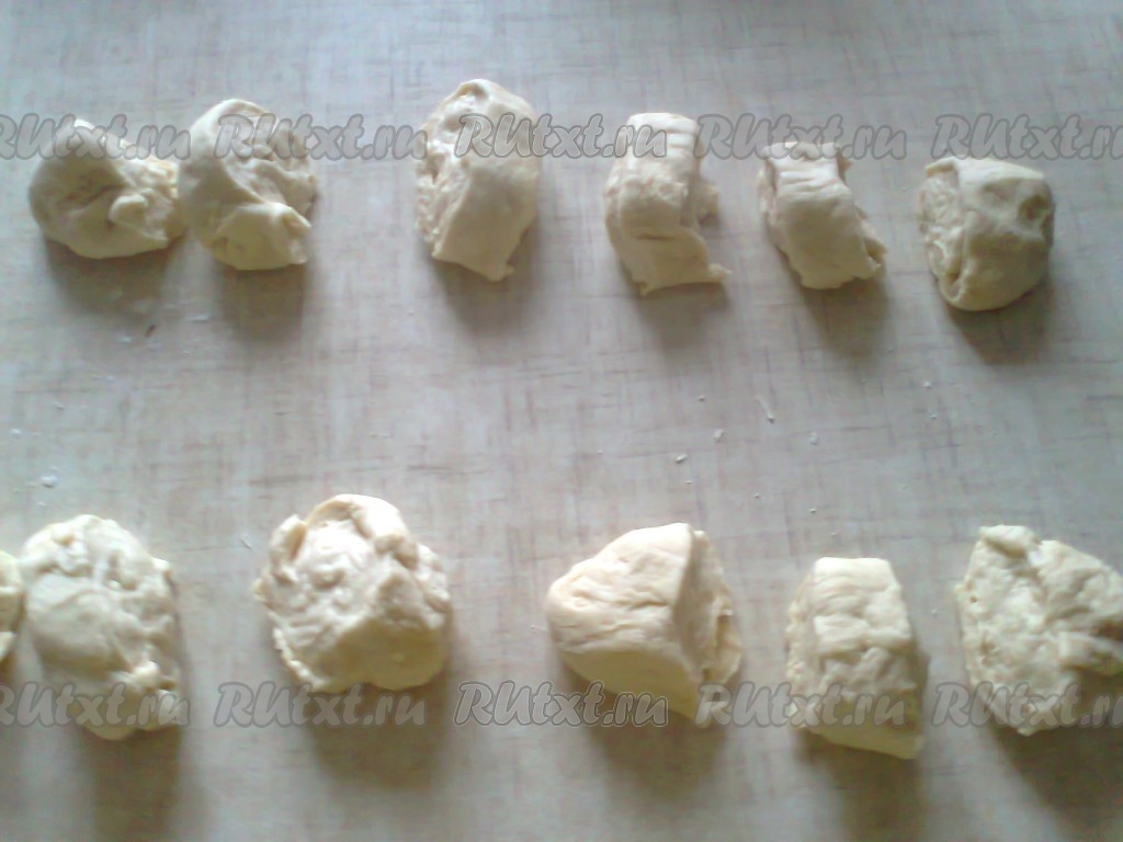 Обмять тесто и разделить его на 12 частей любым удобным вам способом (я разделила тесто на 2 части, скатала каждую часть теста в виде колбаски, а затем разделила на 12 равных частей).
