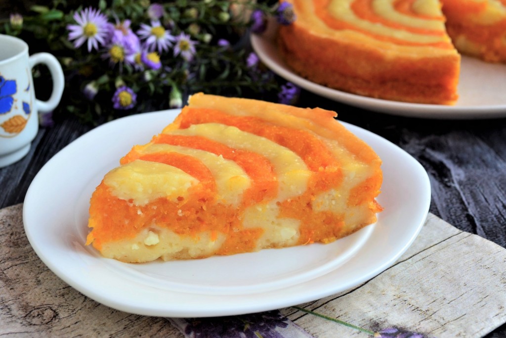 Теперь очень яркий, вкусный и полезный пирог, приготовленный с тыквой и творогом в духовке, можно нарезать на части и подать к столу, дополнив, по желанию, сметаной, джемом или вареньем.