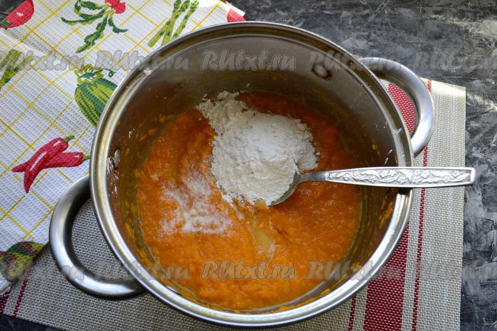 Тщательно перемешать, всыпать 3-5 столовых ложек муки и хорошо перемешать тыквенную смесь.