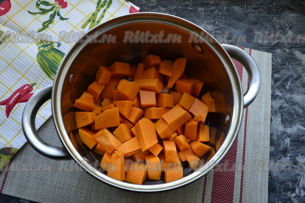 Тыкву очистить от кожуры и семян. 300 грамм очищенной тыквы нарезать кубиками, поместить в кастрюлю, залить водой, а после закипания варить на небольшом огне до мягкости (15-25 минут).