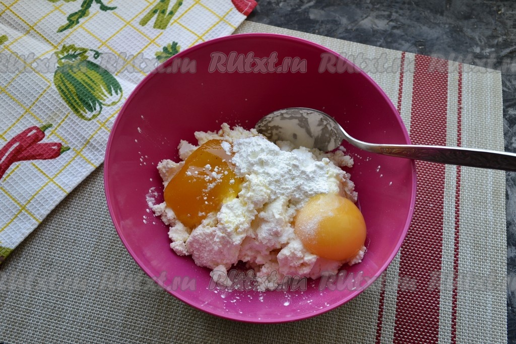 В творог также добавить 1 яйцо, 2-3 столовые ложки мёда, 1 столовую ложку крахмала и ванильный сахар.