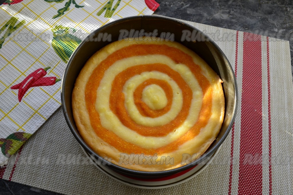 Дно разъёмной формы диаметром 18 см застелить пергаментом. Затем всю форму тщательно смазать сливочным маслом. Выдавливать по кругу кольцами поочередно, начиная от края формы, творожную и тыквенную смеси, как на фото.