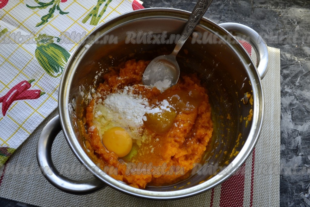 Затем воду нужно по максимуму слить, тыкву остудить и размять (размять можно с помощью вилки или погружного блендера). К тыквенной массе добавить 1 сырое яйцо, 1 столовую ложку крахмала, 2-3 столовые ложки мёда.