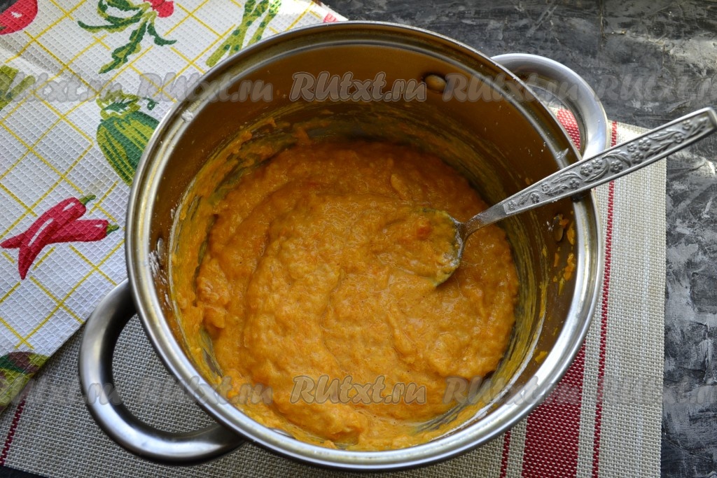 Количество добавляемой муки зависит от сочности и водянистости тыквы, масса должна быть в меру густой, она будет напоминать тесто для оладий.