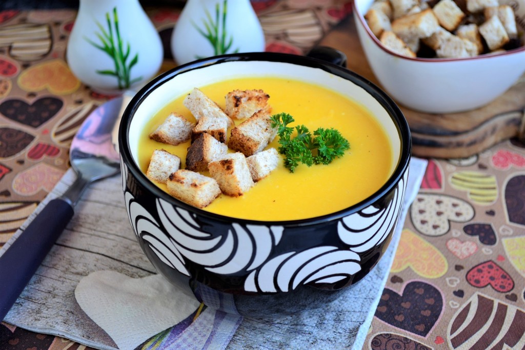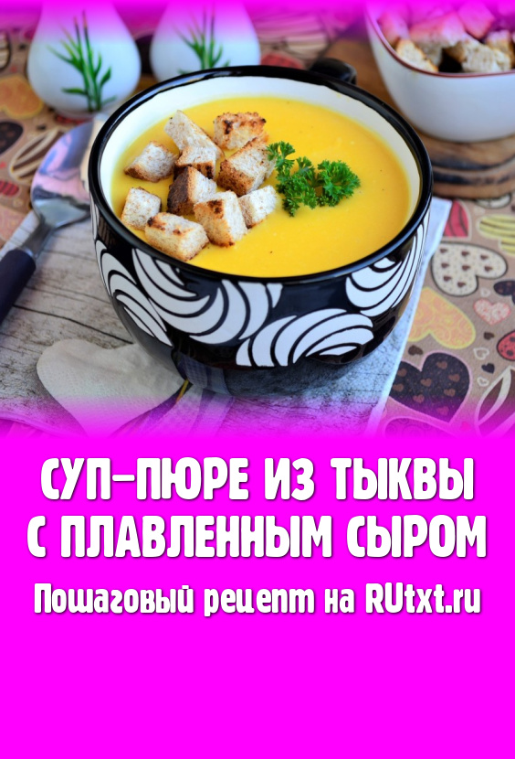 Вкусный, очень полезный, нежный суп-пюре, приготовленный из тыквы с добавлением плавленного сыра, разлить по тарелкам и подать к столу в горячем виде с сухариками.