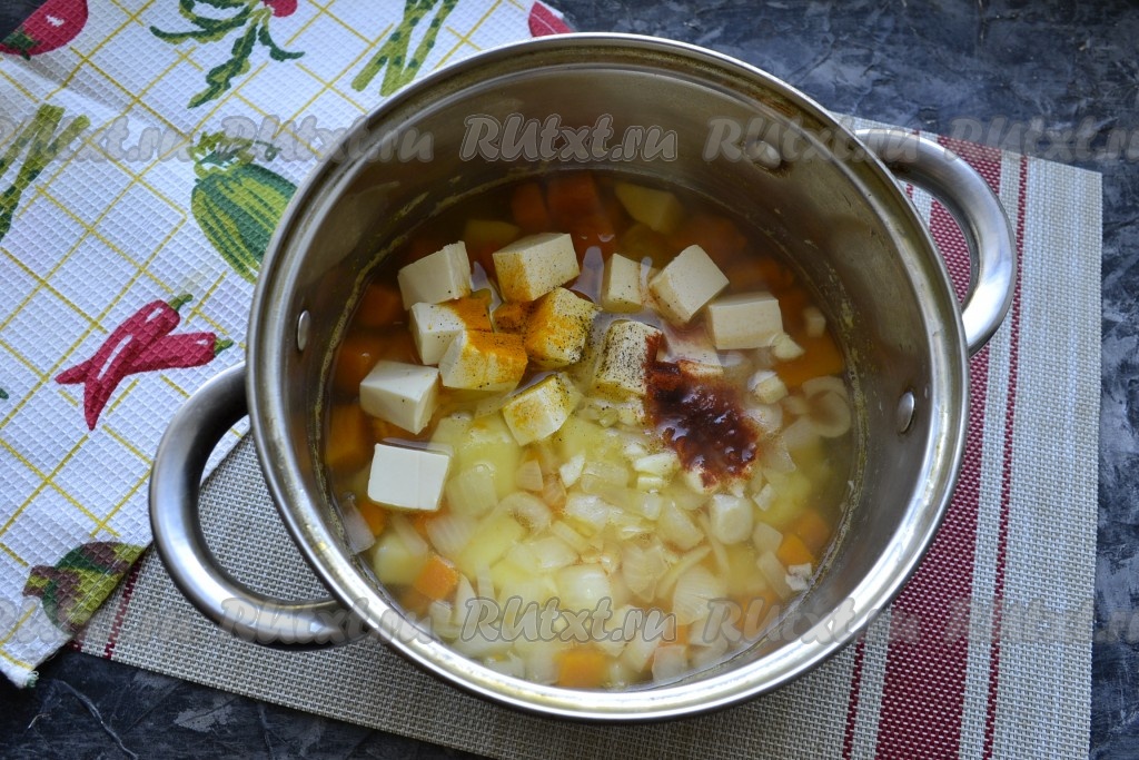 Когда овощи сварятся, добавить в кастрюлю обжаренный лук и плавленный сыр, нарезанный кубиками (или натёртый на тёрке), всыпать специи (я всыпала 1/4 чайной ложки куркумы и 0,5 чайной ложки молотой паприки), измельчённый чеснок и немного чёрного молотого перца.