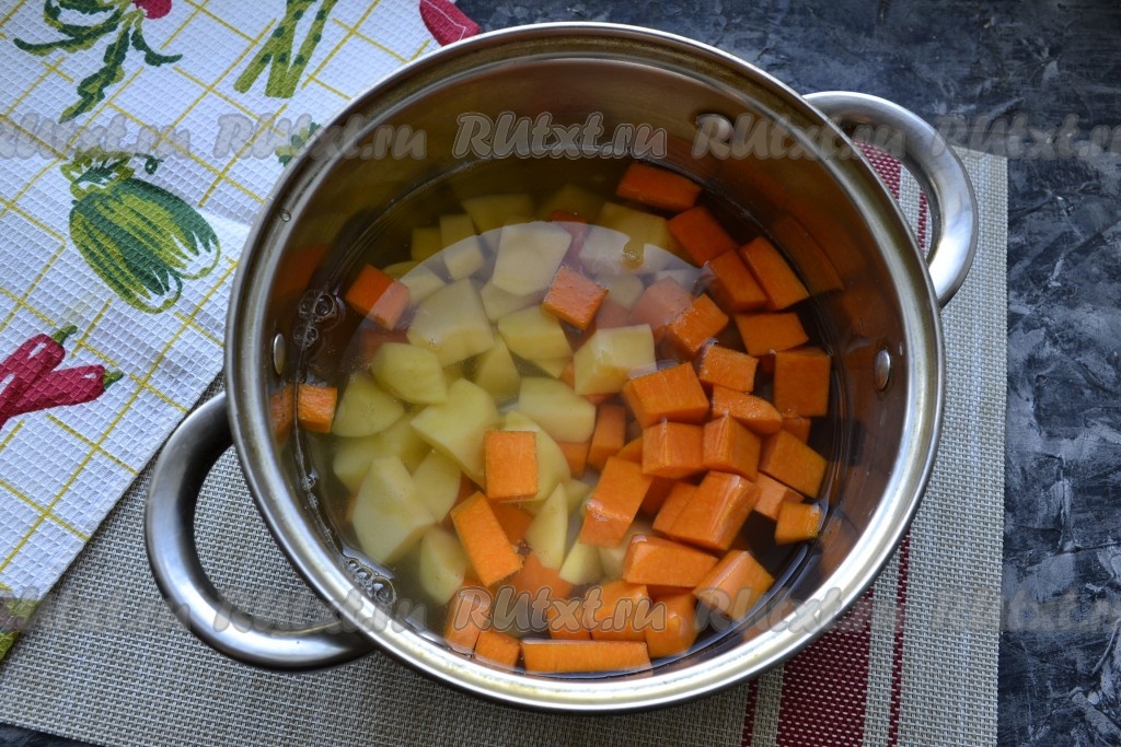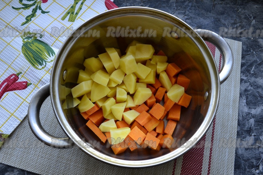 Очистить картофель, чеснок и лук. Очистить от кожуры и семян тыкву. Для приготовления супа потребуется 300 грамм очищенной тыквы. Тыкву и картофель нарезать средними кубиками, поместить в кастрюлю.