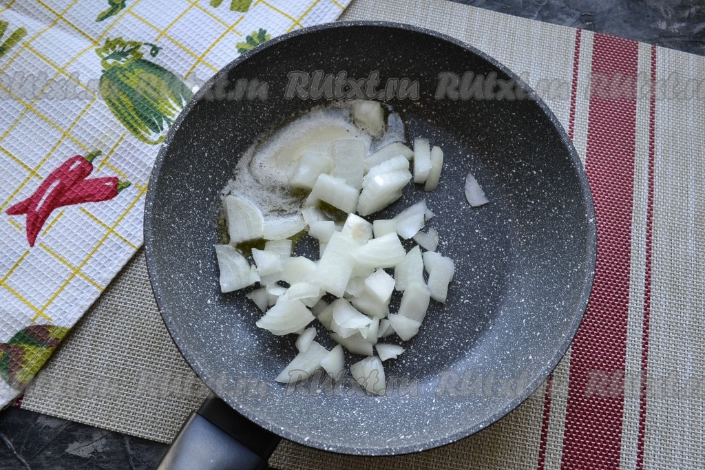 Нарезать луковицу на произвольные кусочки, выложить в сковороду с растопленным сливочным маслом, обжарить на среднем огне, помешивая, до лёгкой золотистости и мягкости.