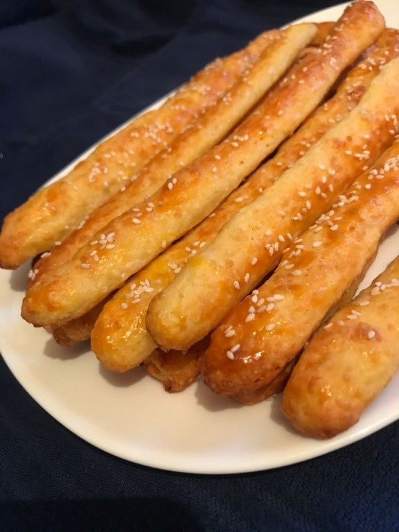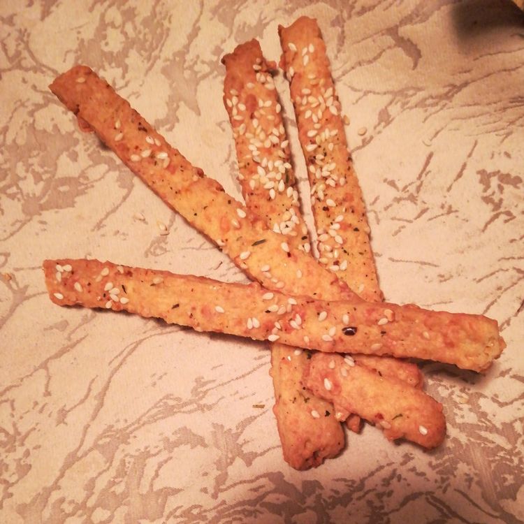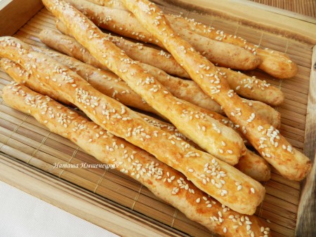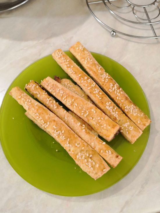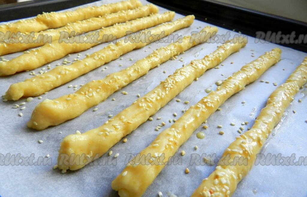 Готовую выпечку достать из духовки. Сырные палочки с кунжутом, приготовленные по этому простому рецепту в домашних условиях, получаются очень вкусными, хрустящими. Их можно подать в качестве дополнения и к чаю, и к различным супам.