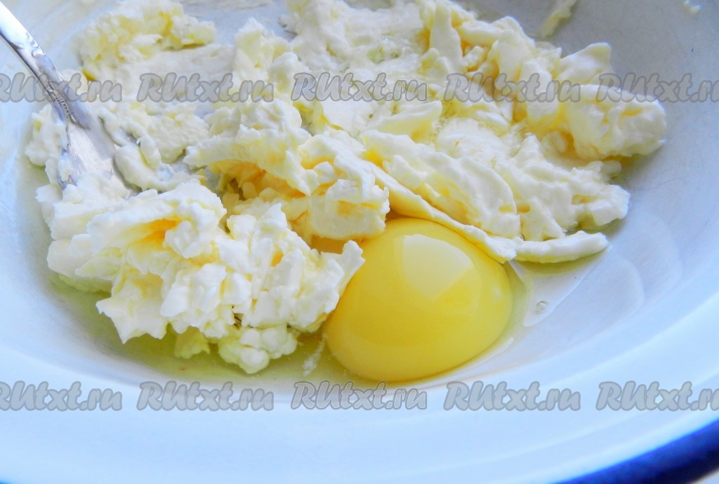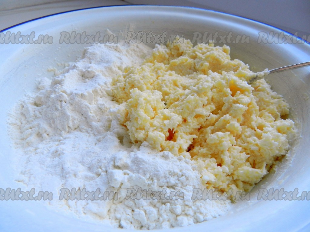 К смеси масла и яйца добавить сыр, растереть вилкой до однородности. Всыпать сахар, соль (если сыр очень солёный, соль можно не добавлять), перемешать. Добавить 100 грамм муки и разрыхлитель, перемешать вилкой.