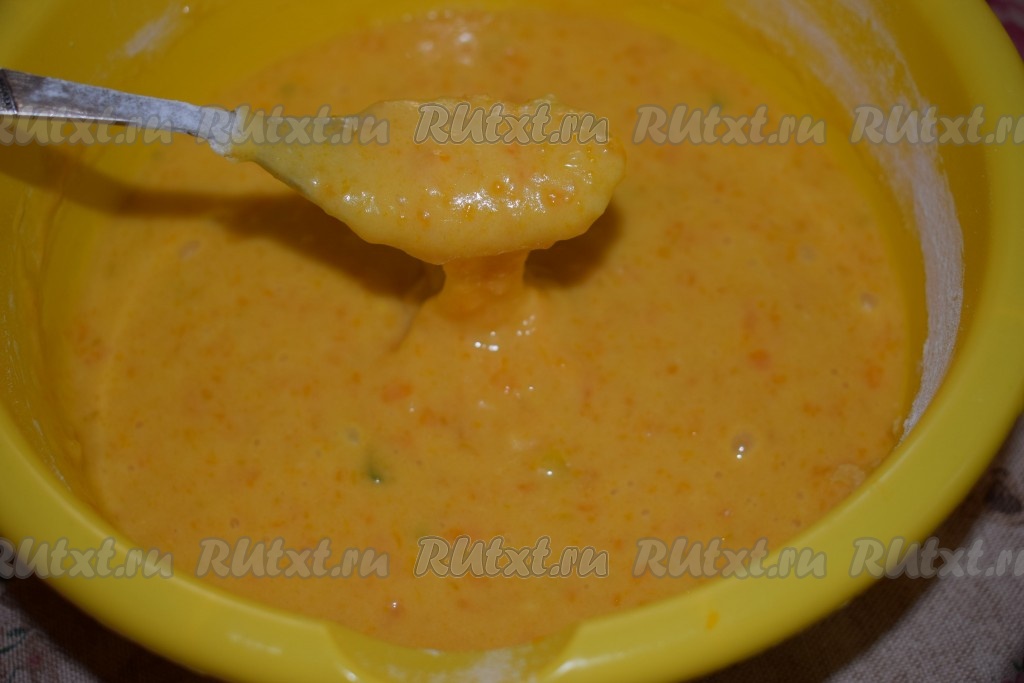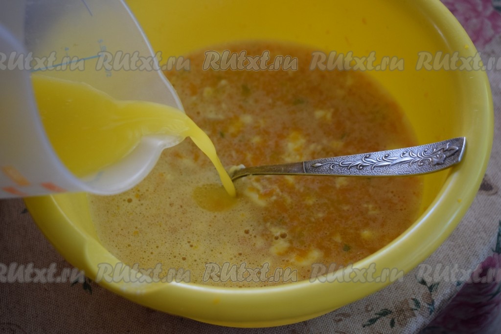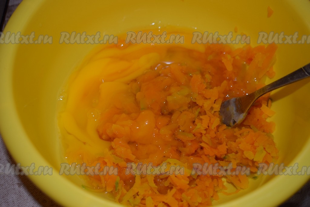 Теперь быстро замешиваем тесто. Для этого оставшуюся натёртую тыкву кладём в глубокую миску, добавляем яйца и хорошо перемешиваем вилкой (или ложкой).