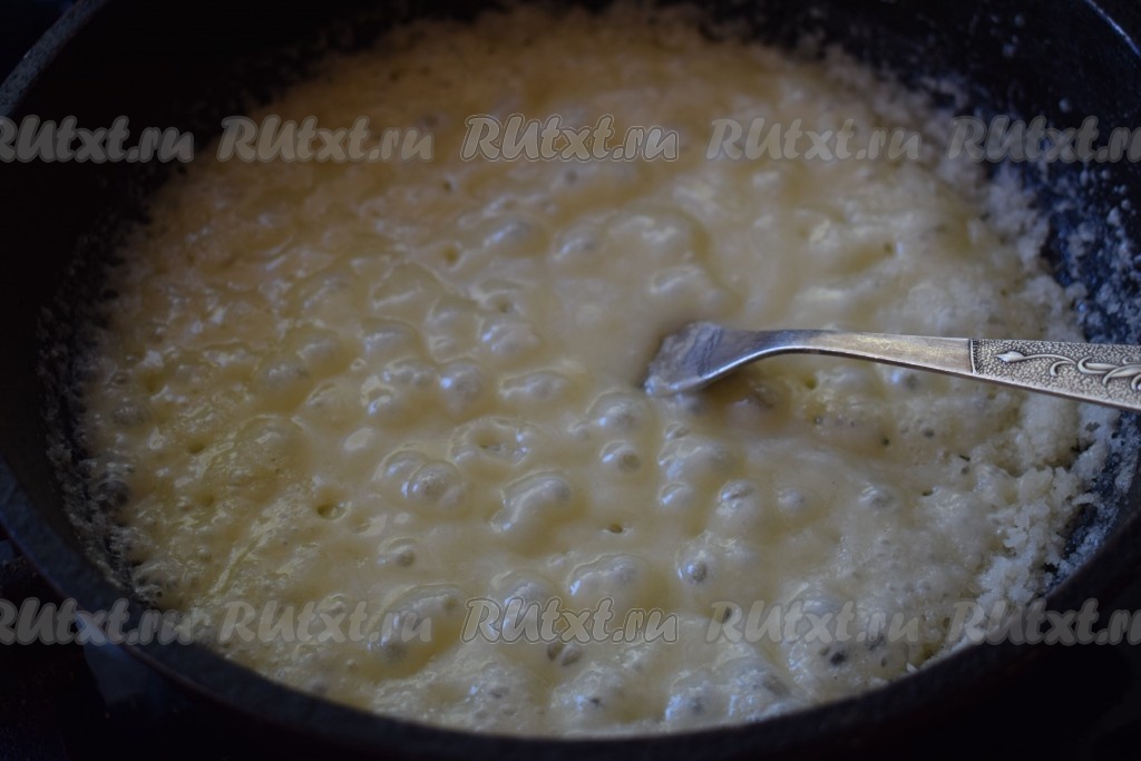 Когда карамель слегка остынет, она приобретёт прозрачно-желтоватый оттенок. Накрываем карамель крышкой, чтобы замедлить процесс остывания и образования корочки.