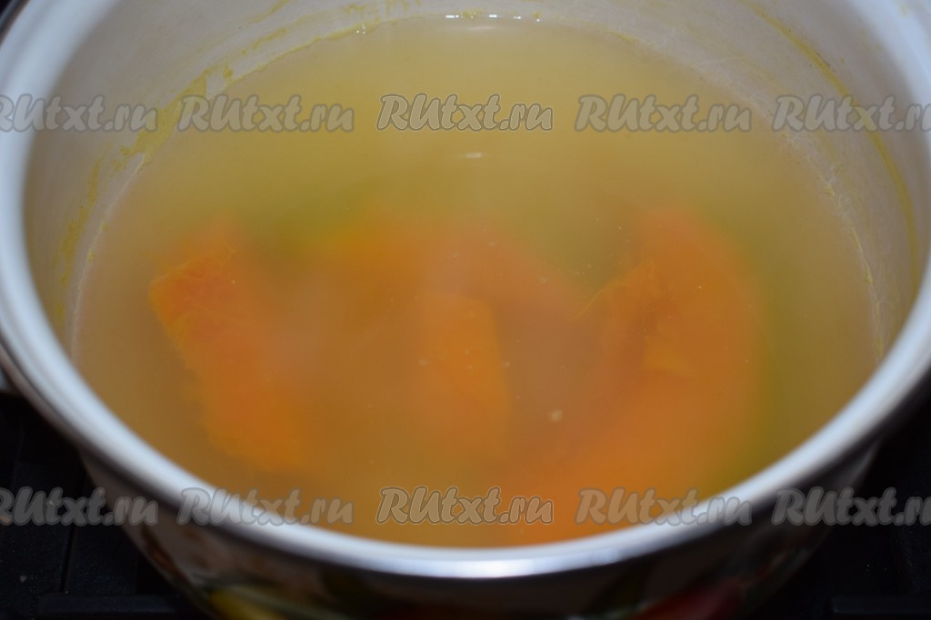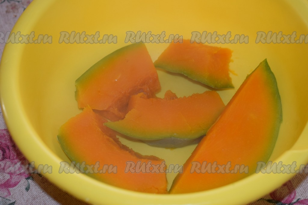 Для приготовления маффинов сначала отварим тыкву. Количество тыквы в рецепте указано уже в варёном и очищенном от кожуры виде, я брала около 270 грамм сырой тыквы. Тыкву очищаем от семян, удаляем кожуру, нарезаем на дольки и отправляем в кипящую воду.