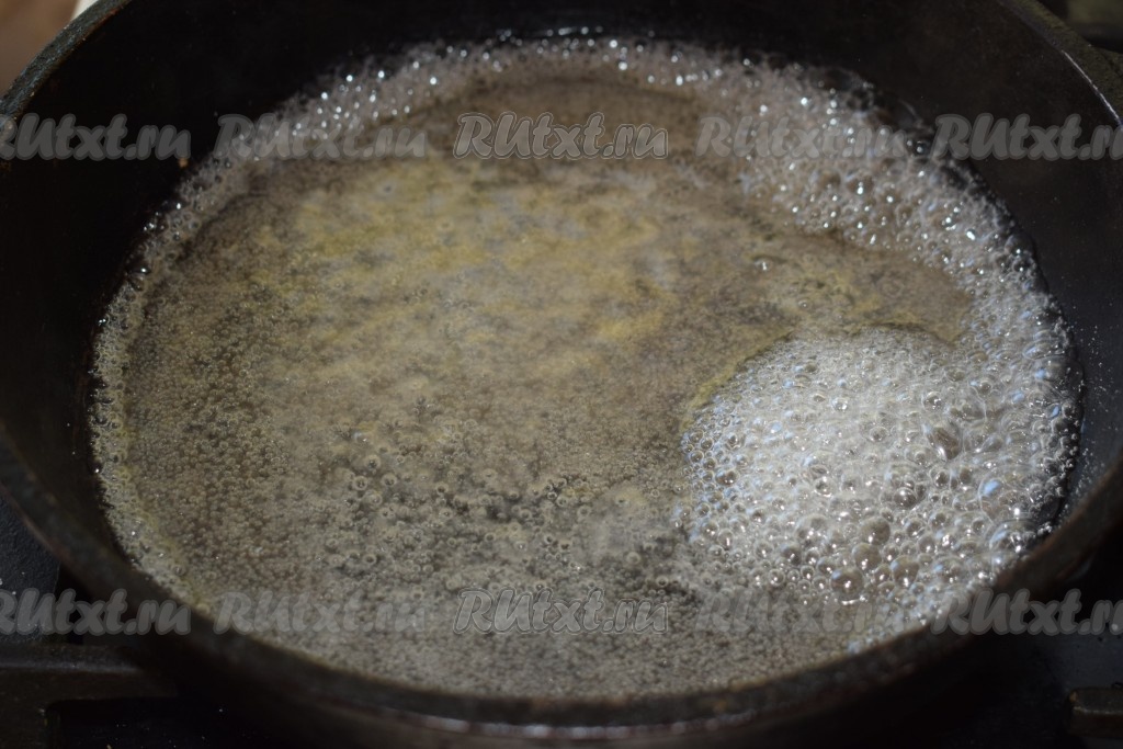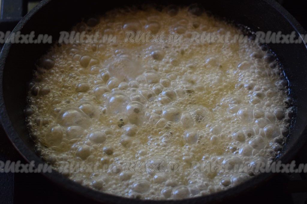 Включаем средний огонь. Один раз перемешиваем сахар с водой и больше его не трогаем, пусть процесс карамелизации идёт сам по себе (важно не перемешивать!). Когда сахар с водой начнут кипеть, уменьшаем огонь и увариваем сахар до лёгкого изменения цвета (примерно, 5 минут).
