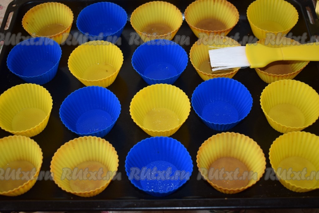 Далее расставляем силиконовые формочки для маффинов на противень и смазываем их растительным маслом при помощи кулинарной кисти. Выход по данному рецепту 20 маффинов.
