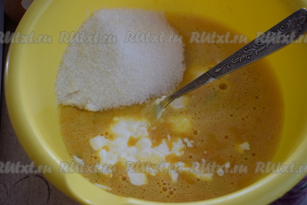 Добавляем сахар, сметану и ещё раз перемешиваем.