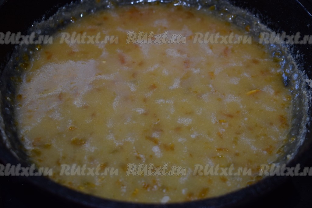 Далее варим карамель с сыром около 2 минут и добавляем 50 грамм натёртой тыквы, перемешиваем до однородности и выключаем огонь.