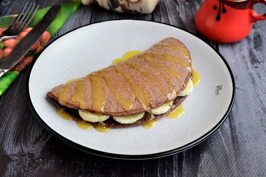 Очень вкусный и полезный шоколадный овсяноблин переложить со сковороды на тарелку и подать его, дополнив, например, кружочками банана и мёдом.