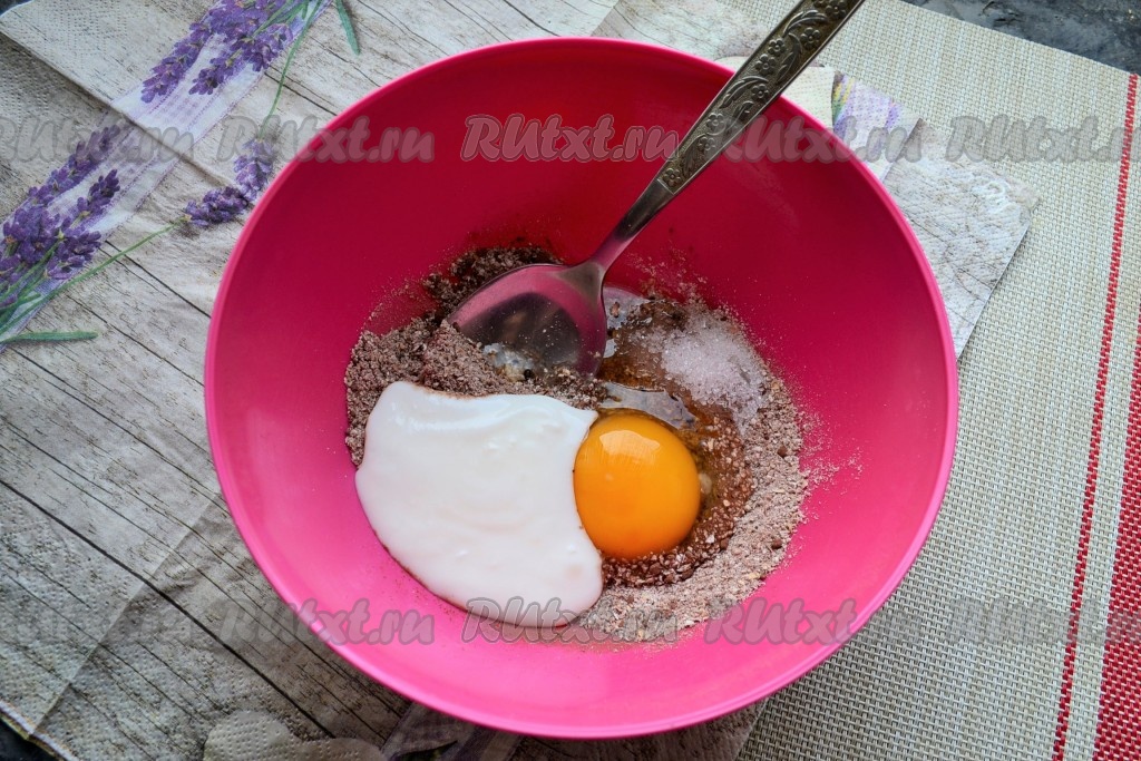 Сюда же добавить яйцо, сахар и кефир комнатной температуры.