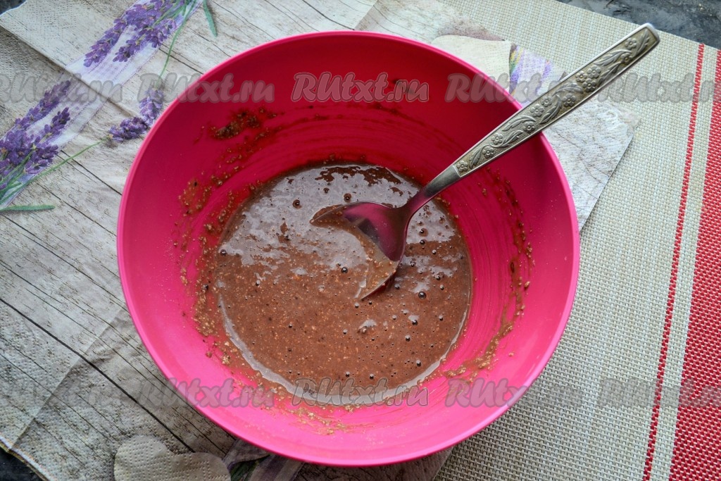 Добавить растительное масло, хорошенько перемешать ложкой. Тесто для приготовления шоколадного овсяноблина получится, напоминающим по консистенции густой кефир, оставить его на 5-6 минут.