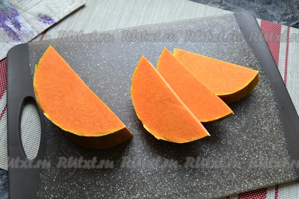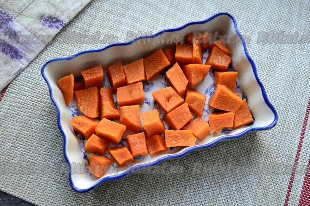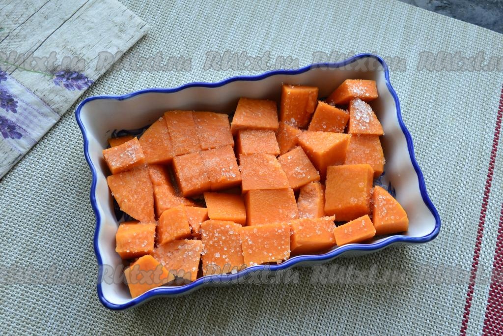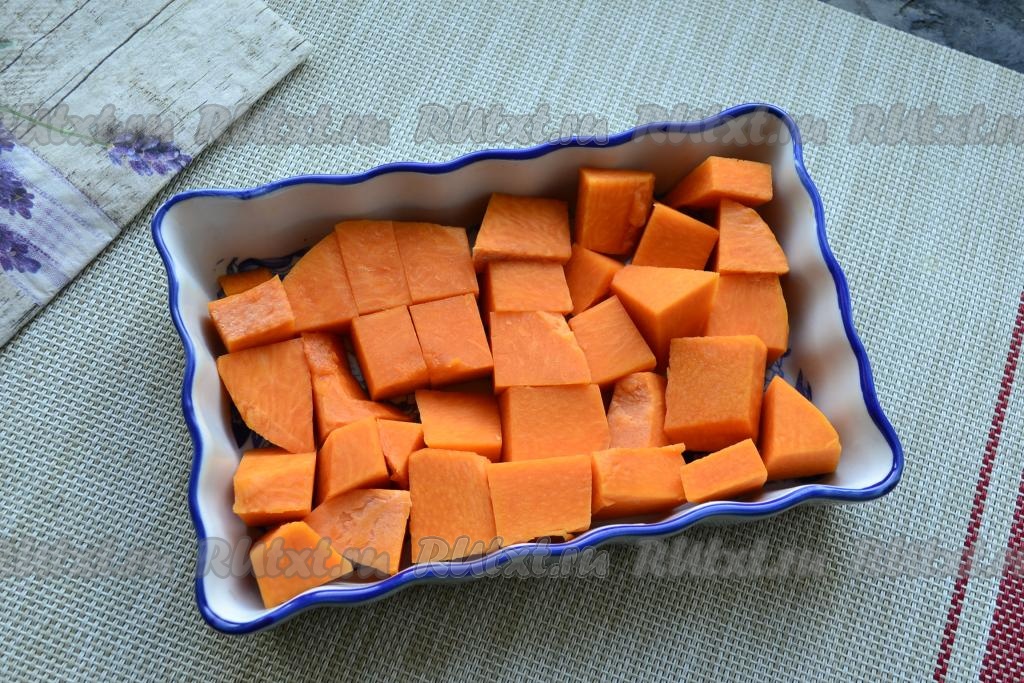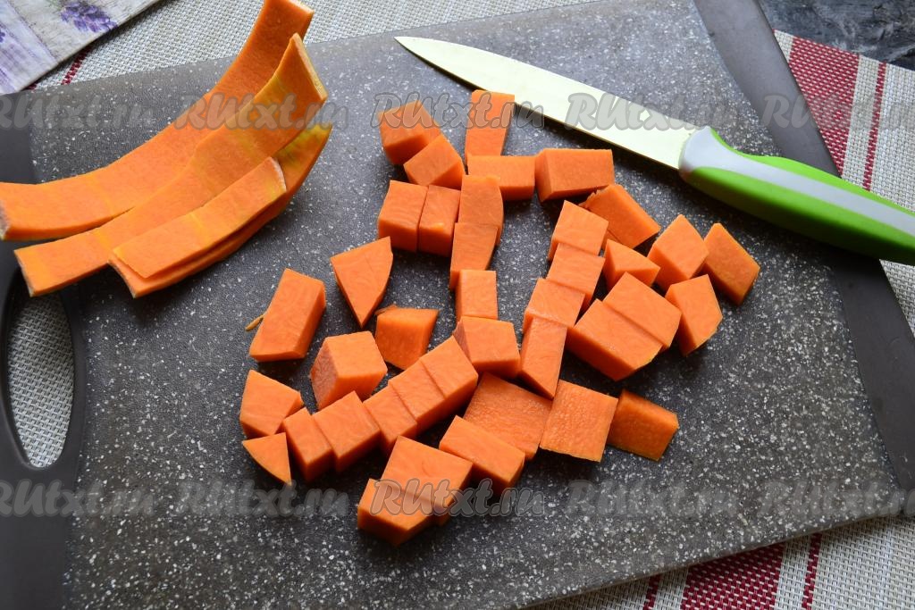 Очистить от кожуры и нарезать мякоть тыквы на небольшие кубики.